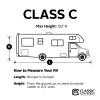 Zippered panels allow complete access to all entrances. Triple-ply PolyPRO 3 keeps out rain and snow. Thick, triple-ply top and single-ply sides protect against rain, snow, dirt, nicks and scratches for all-season protection. An integrated air vent system combined with quick drying PolyPRO sides reduce wind stress and vent inside moisture. Adjustable front and rear tension panels and elasticized hem corners provide a custom fit. Integrated rope attachment system and a provided toss bag helps reduce crawling under the RV. Zippered panels allow access to the RV doors and engine areas. Stuff sacks are included on all covers. Ladder caps are included. 3 Year Warranty. Fits Class C RV Covers 32' - 35'.